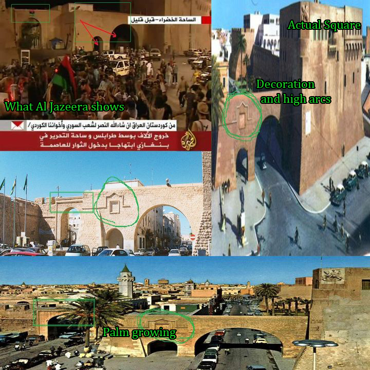Perhatikan gambar di bawah ini (klik untuk memperbesar). Di gambar kiri atas adalah foto capture dari Al Jazeera, bandingkan dengan foto-foto asli pemandangan Green Square di sebelah kanan dan bawah.