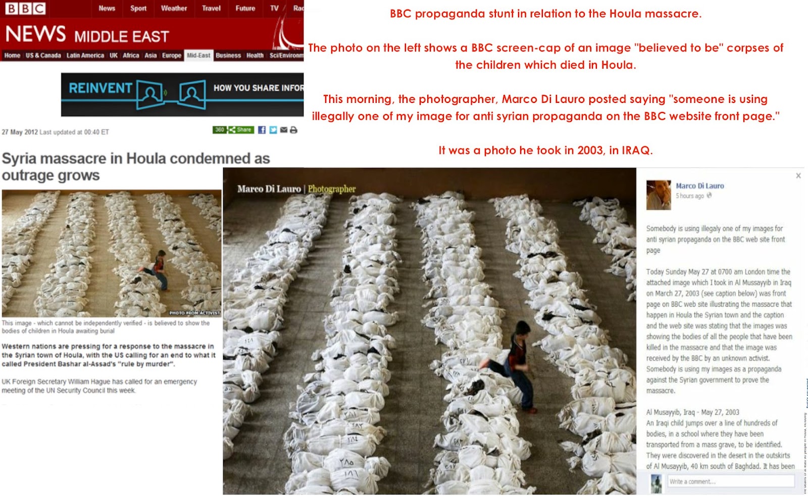 Kali ini di Syria, BBC tertangkap basah melakukan hal serupa Di situsnya tgl 27 Mei, BBC memuat foto mayat2 dan diklaimnya sebagai korban pembantaian massal di di Houla (dan tentu saja, yang dituduh sebagai pembantai adalah tentara Suriah, padahal, fakta2 lain menunjukkan bhw yang terbantai itu adalah orang-orang pro pemerintah; juga secara logika saja, tidak ada keuntungan yang bisa didapat Assad dengan membantai massal warganya sendiri; sungguh aneh bila Assad yang melakukannya. Keuntungan dari peristiwa ini justru didapat oleh pihak oposan.).