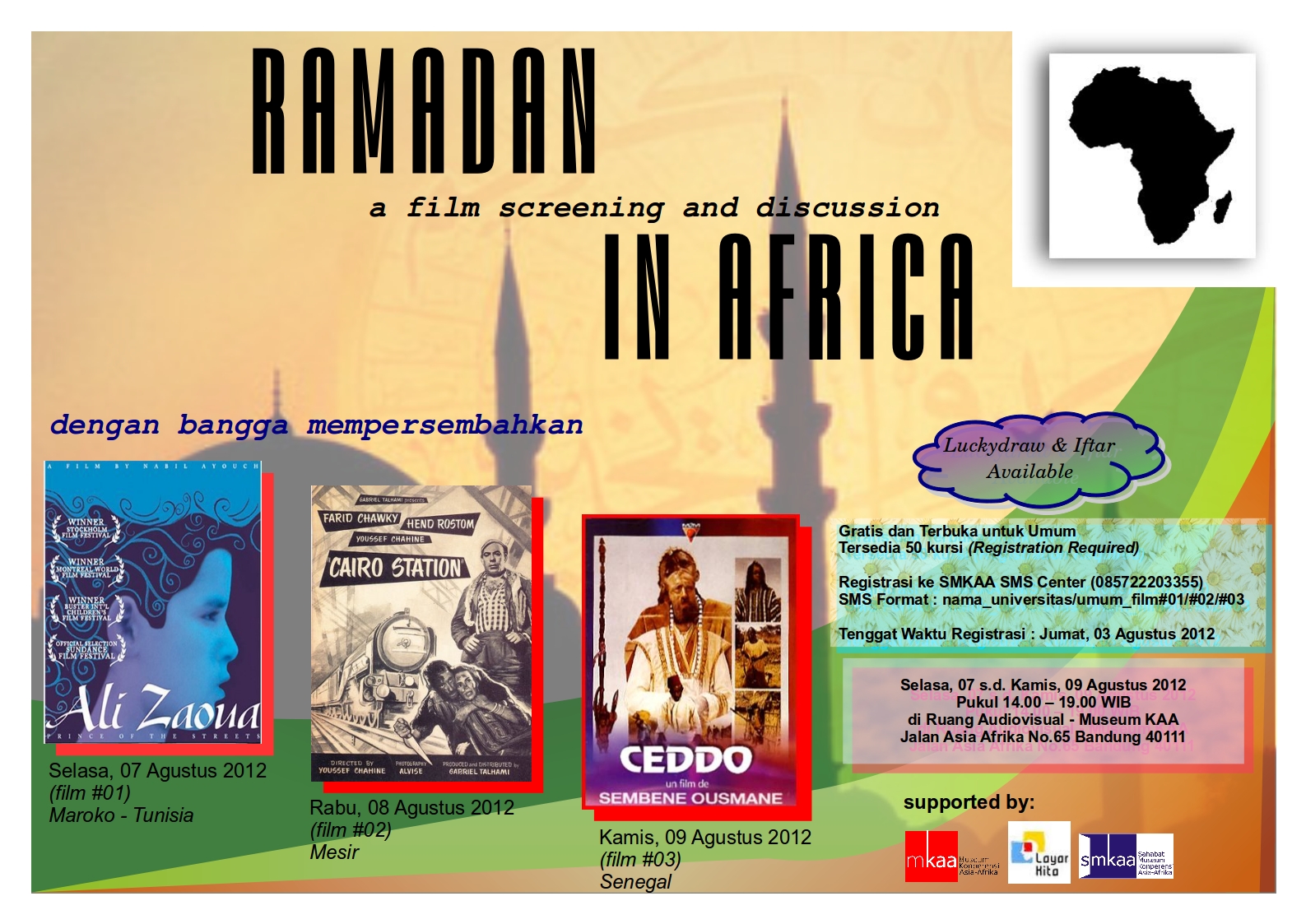 Di bulan Ramadan ini, Museum KAA, mulai Selasa, 07 hingga Kamis, 09 Agustus 2012, setiap pukul 14.00 –19.00 WIB di Ruang Audiovisual Museum KAA, akan menghadirkan program pemutaran dan diskusi film bertajuk “Ramadan in Africa”. Selama tiga hari berturut-turut, pengunjung museum akan dimanjakan oleh tiga buah film terbaik dari benua Afrika, Prince de la Rue (2000), Cairo Station (1958), dan Ceddo (1975). “Ramadan in Africa” diharapkan dapat menjadi program edukatif pilihan masyarakat untuk berkunjung ke museum di bulan Ramadan.