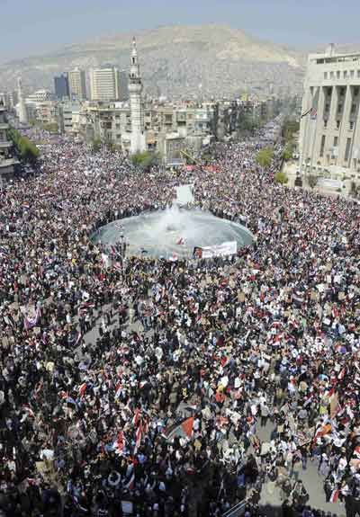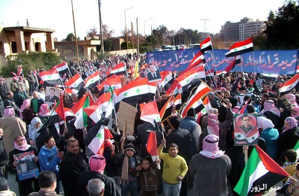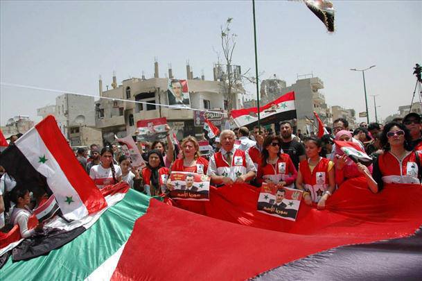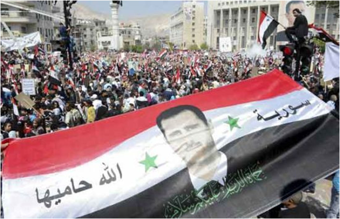 Foto-foto berikut ini membuktikan bahwa ADA rakyat Suriah yang memang tak mendukung aksi jihad. Saat melihat foto-foto Suriah, perhatikan benderanya. Bila orang-orang membawa bendera merah-putih-hitam, itu adalah bendera resmi Suriah dan yang mengibarkannya pastilah pro Assad, atau pro Suriah (sangat mungkin tidak pro Assad tapi mereka tak mau negara mereka dihancurkan milisi bayaran dari luar negeri). Sebaliknya, bila mereka membawa bendera hijau-putih-hitam, artinya mereka ini pendukung terorisme (tentu saja, mereka menyebutnya ‘jihad’, meski itu diwarnai dengan pengeboman di berbagai fasilitas publik termasuk sekolah dan universitas; bom bunuh diri, membantai dan memutilasi para ulama Sunni, antara lain Syekh Buthy dan Syekh Seifeddin, membongkar kuburan sahabat Nabi, serta memakan jantung mayat tentara Suriah). Perlu diketahui, bendera hijau-putih-hitam adalah bendera Suriah saat masih dijajah Prancis.
