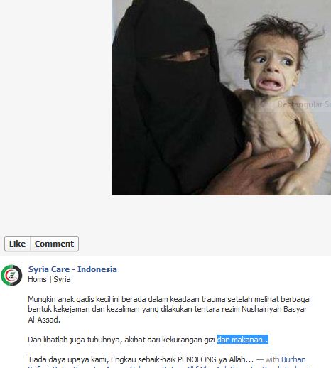 Dan satu-dua menit, luangkan waktu untuk mendownload foto itu, masukkan ke google image, dan Anda akan tahu, itu foto korban kelaparan di Yaman, bukan korban kekejaman Assad seperti yang ditulis Syria Care. Bisa klik di sini. Dan ini bukan satu-satunya foto ‘palsu’. Banyak sekali, bisa klik koleksinya di sini. Situs semacam Syria Care pun bukan satu-satunya, menyedihkan sekali.