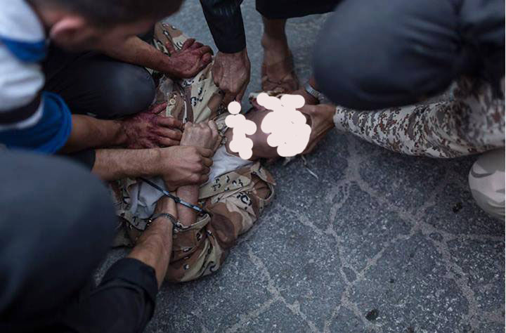 Ini salah satu foto yang diambil sang jurnalis (klik foto utk memperbesar; bagian leher ada pisau terhunus, saya kaburkan dengan photoshop, karena saya sendiri mual setiap melihat foto ini)