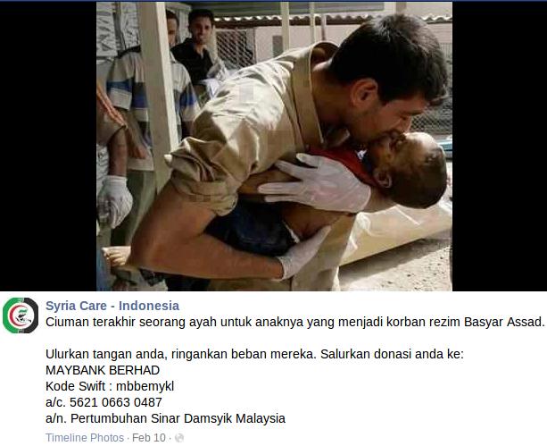 Sekedar contoh saja, ini salah satu foto yang disebarluaskan para simpatisan jihad itu (sekalian minta donasi):