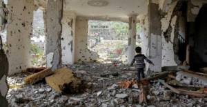 Foto: seorang anak Yaman di sebuah puing gedung yang dibom Saudi (18 Maret 2018/AFP), menurut UNICEF (2018), setengah juta anak Yaman terpaksa putus sekolah sejak 2015 akibat perang.