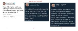 Tapi setelah ia menjadi presiden, dia mentweet, menyalahkan Obama, kurang-lebih, “Kalau saja dulu Obama menyerang Suriah secara langsung, Assad sudah mati dan masalah Suriah sudah selesai!” (foto 2)