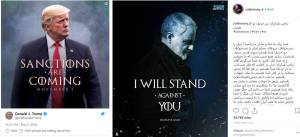 Kini, Trump mencuit dengan menggunakan meme ala GoT: sanksi akan datang pada 5 Nov. Yang dimaksud adalah sanksi terhadap Iran; AS terus menuduh Iran sedang membuat senjata nuklir dan memberi sanksi ekonomi [melarang negara-negara dunia menjalin bisnis dengan Iran].
