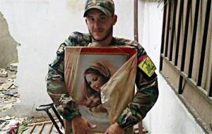 Foto: tentara Hez sedang memeluk lukisan Bunda Maria, yang ditemukan saat mereka membebaskan desa-desa di perbatasan Lebanon-Suriah dari cengkeraman ISIS (2015).