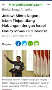 Jokowi juga mengajak semua negara yang memiliki Kedutaan Besar di Tel Aviv, Israel, untuk tidak mengikuti keputusan AS memindahkan kedutaan mereka ke Yerusalem.