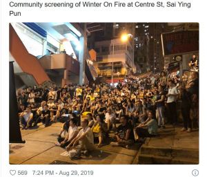 Saya coba googling untuk mencari tahu, ternyata pada 29/8/ 2019, aktivis “demokrasi” (atau tepatnya: separatisme) HK mengadakan acara nobar di 40 tempat. Film yang ditayangkan adalah film “Winter on Fire: Ukraine’s Fight for Freedom”, film propaganda karya sutradara Israel kelahiran Rusia, Evgeny Afineevsky.