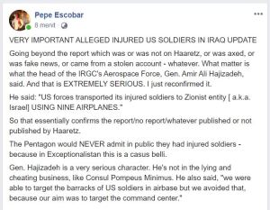 Hajizadeh mengatakan, “Pasukan AS mengangkut tentaranya yang terluka ke “entitas Zionis” [a.k.a. Israel] MENGGUNAKAN 9 PESAWAT.”