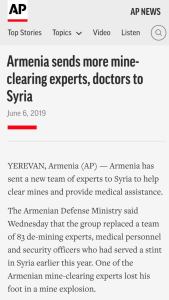 Di skrinsyut berita tahun 2019 ini disebutkan bahwa Armenia mengirim dokter untuk memberikan bantuan medis kepada warga Aleppo dan tim anti-ranjau untuk melucuti ranjau yang dipasang “jihadis” di kota itu. Baru-baru ini (Mei 2020), di masa Covid, Armenia juga mengirim tim medis dan lebih dari 2 ton fasilitas medis.