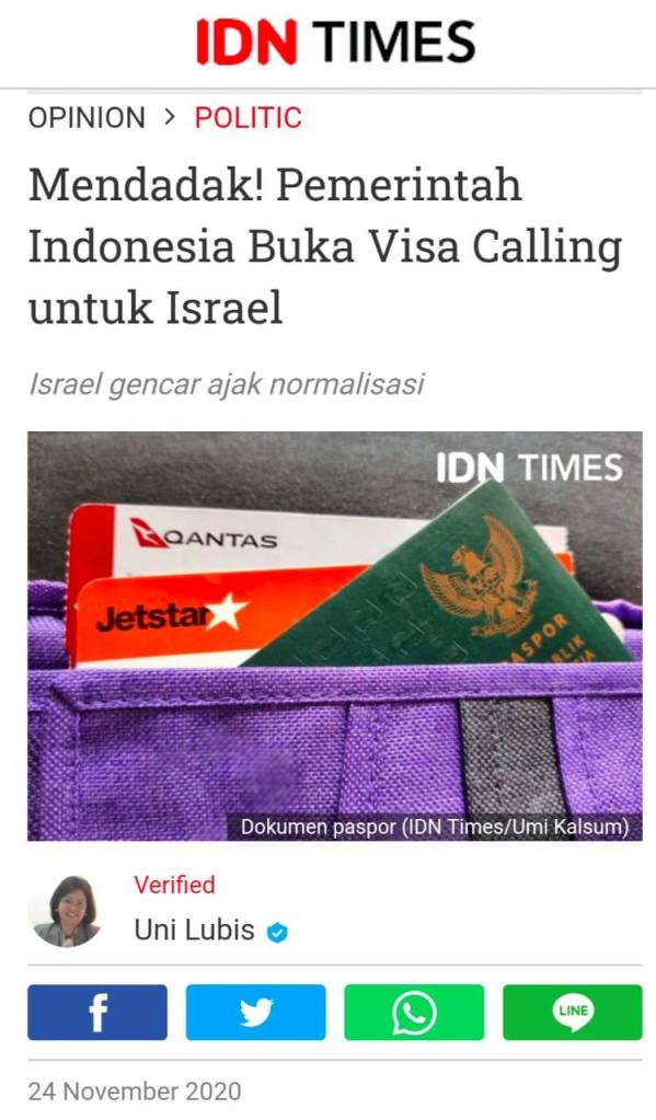 Baca selengkapnya tulisan jurnalis senior, Uni Lubis, membahas masalah ini: https://www.idntimes.com/opinion/politic/amp/uni-lubis/mendadak-pemerintah-indonesia-buka-visa-calling-untuk-israel