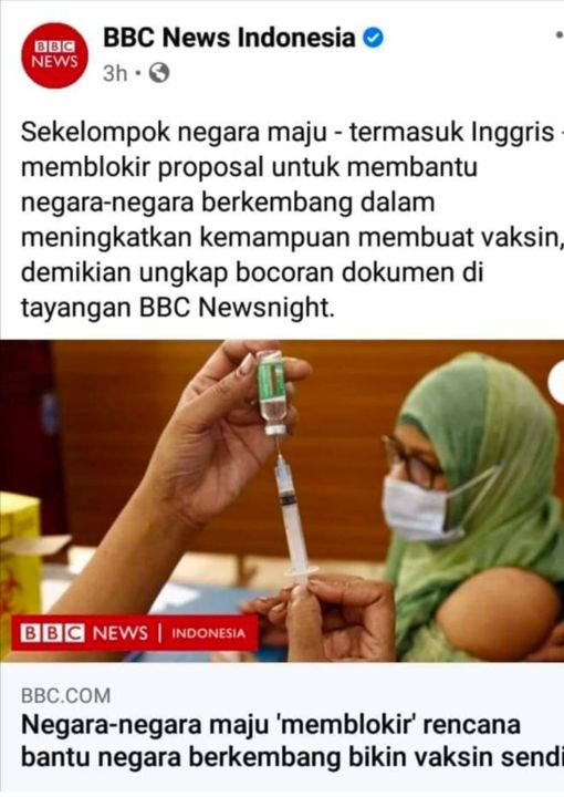 Tadi malam saya membaca berita dari BBC. Menurut dokumen WHO, Inggris adalah salah satu di antara negara maju yang memblokir proposal untuk membantu negara-negara berkembang dalam meningkatkan kemampuan membuat vaksin.