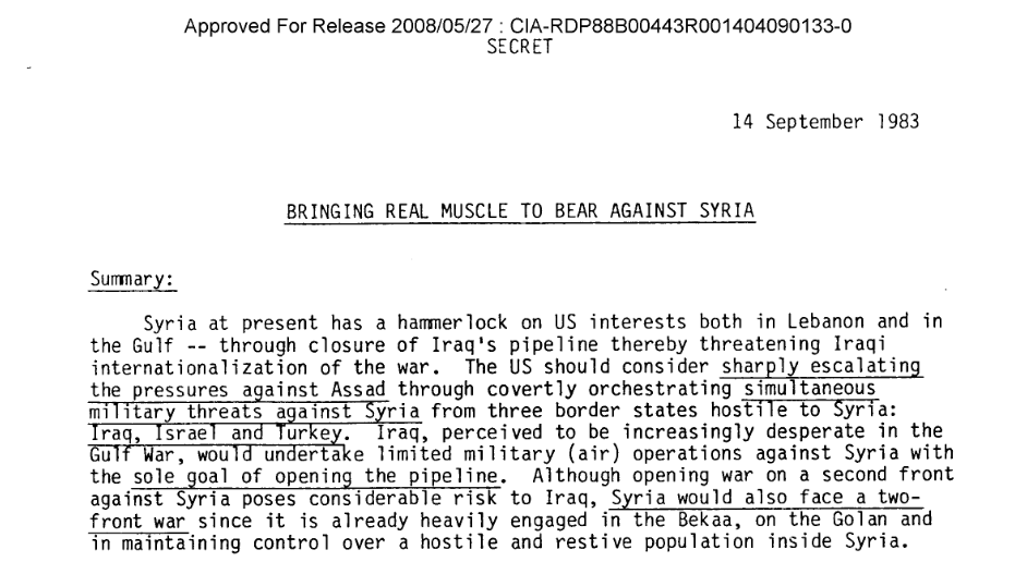 Dokumen CIA tahun 1983: CIA merekomendasikan agar Pemerintah AS meningkatkan tekanan kepada Assad dengan merancang diam-diam serangan militer di perbatasan Irak, Israel, dan Turki. Artinya, Suriah ini memang musuh bebuyutan AS (dan Israel) dari dulu.
