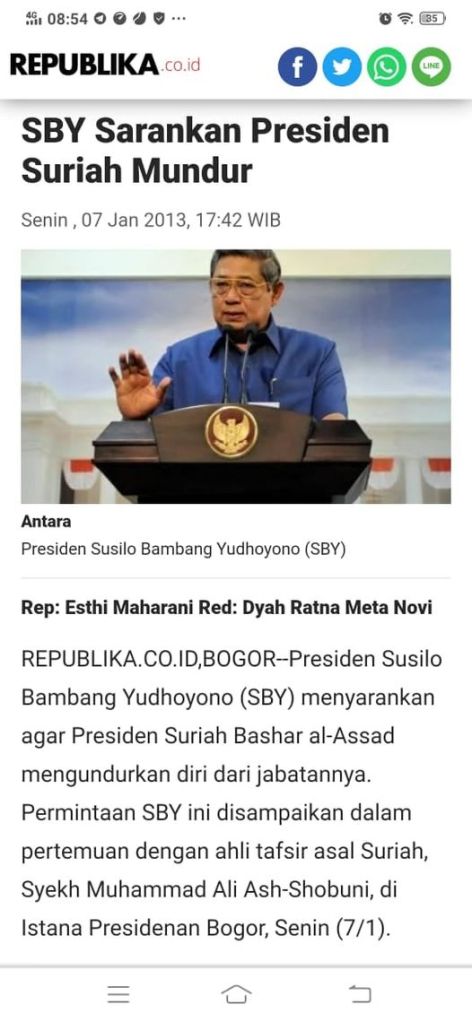 Jangan lupa, pada 2013 SBY pernah menyarankan agar Assad mundur saja. Ini disampaikan SBY saat bertemu “ulama” Suriah yang pro-jihadis, Syekh Muhammad Ali Ash-Shobuni.