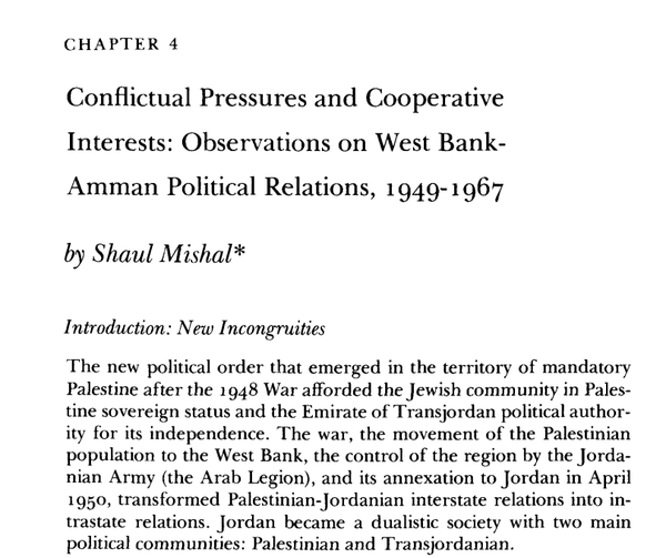 Saya akan mengutip buku berjudul “Palestinian Society and Politics” (Migdal, et. al.), terbitan Princeton University Press (1980). Bab 4-nya ditulis oleh Shaul Mishal, berjudul “Conflictual Pressures and Cooperative Interests: Observations on West Bank-Amman Political Relations, 1949–1967.” Shaul menuliskan hasil risetnya mengenai dinamika politik di Yordania pada era aneksasi tersebut.