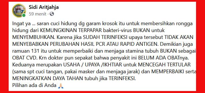 **drh Indro: lakukan bilas hidung dengan larutan garam krosok (non-yodium) 1% untuk membersihkan rongga hidung dari paparan virus; sehingga saat dites, hasilnya negatif (karena tidak ada virus menempel lagi di hidung). Tentu saja, kalau sudah sakit (virus sudah menginfeksi tubuh, tidak sekedar menempel di hidung) hasil tesnya akan positif. Bedakan antara “terpapar” dan “terinfeksi.”