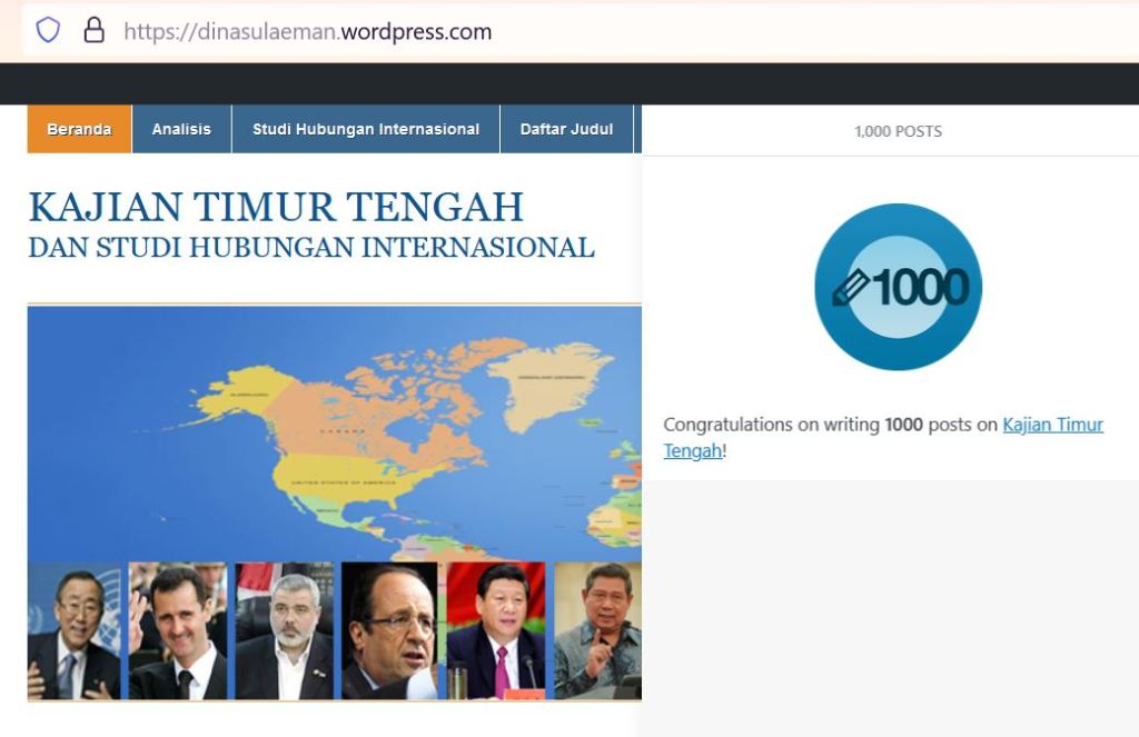Pagi ini, saya mendapati notifikasi di blog saya (dinasulaeman.wordpress.com), ternyata sudah ada 1000 postingan di sana. Saya jadi rada mellow, tersadarkan bahwa sudah 14 tahun saya membuat blog tersebut. 14 tahun yang penuh suka duka, dan merekam perjalanan “intelektualitas” saya.