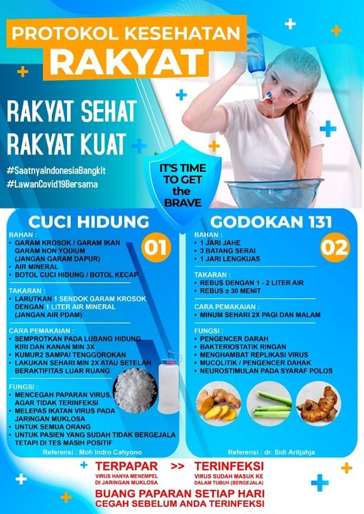 Hasil kerja keras dua lelaki itu pun menjadi solusi praktis buat kita, disebut PROTOKOL KESEHATAN RAKYAT. (1) setiap pulang dari bepergian, atau menjelang tas tes tos, lakukan cuci hidung dengan larutan garam non-yodium 1%(2) setiap hari rutin minum 131, hangat, seger, menyehatkan, dan bikin setrong.