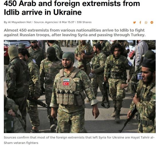 Hampir 450 ekstremis Arab dan warga negara asing telah tiba di Ukraina dari Idlib untuk berperang melawan pasukan Rusia; tiga hari setelah mereka meninggalkan Suriah, melewati Turki. Sekitar 300 petempur ini adalah warga negara Suriah yang berasal dari pedesaan Idlib dan Aleppo, sementara 150 lainnya adalah warga negara Belgia, Prancis, Cina, Maroko, Tunisia, Chechnya, dan Inggris.