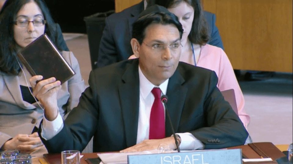 Foto: eks-Dubes Israel untuk PBB, Danny Danon, dalam sidang di Dewan Keamanan PBB, dia membacakan ayat di Bible dan mengatakan bahwa legitimasi negaranya adalah Bible (“This is the deed to our land”). April 29, 2019. https://www.jpost.com/…/israeli-ambassadors-bible…
