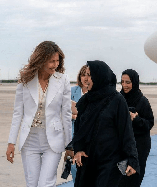 Assad didampingi oleh istrinya, Asma Al Assad. Di bandara, Asma disambut oleh Dr Maitha bint Salem Al Shamsi, menteri dalam negeri UAE.