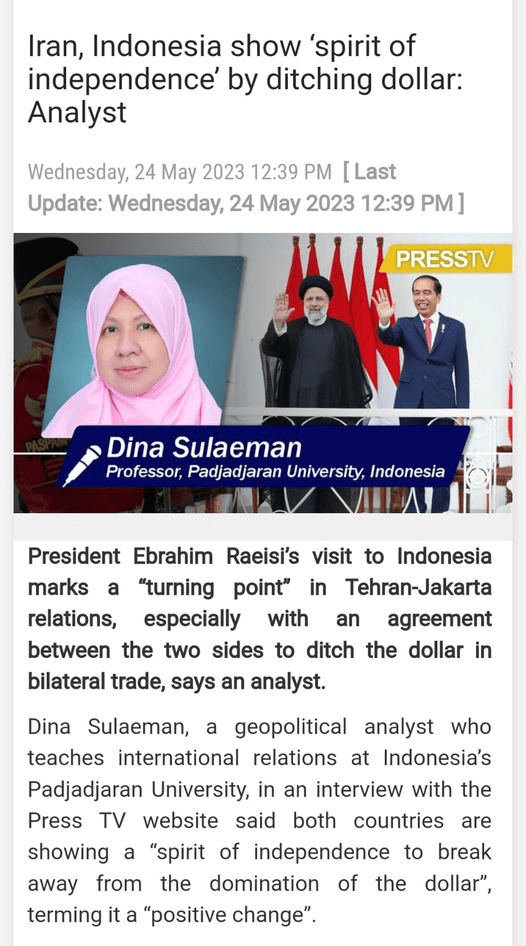 Dina Sulaeman, seorang analis geopolitik yang mengajar Hubungan Internasional di Universitas Padjadjaran Indonesia, dalam sebuah wawancara dengan website Press TV mengatakan kedua negara menunjukkan “semangat independensi untuk melepaskan diri dari dominasi dolar”, menyebutnya sebagai “perubahan positif ”.