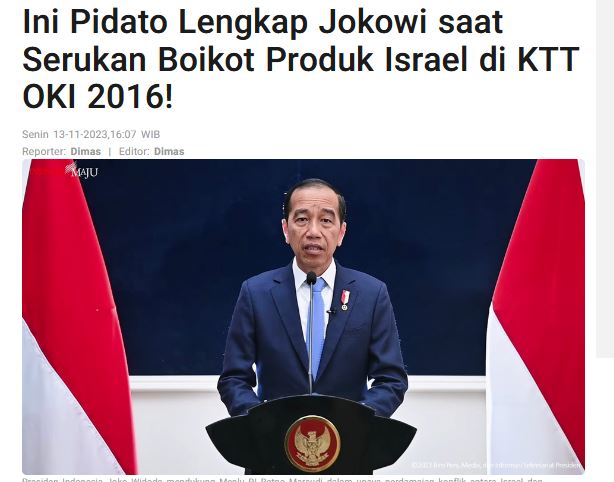 Di medsos beredar potongan video Presiden Jokowi mengenai boikot produk Israel. Setelah saya cek, itu video lama (KTT OKI 2016), sementara di KTT OKI Riyadh November tahun 2023, sama sekali tidak ada seruan boikot. (Link transkrip di bawah)