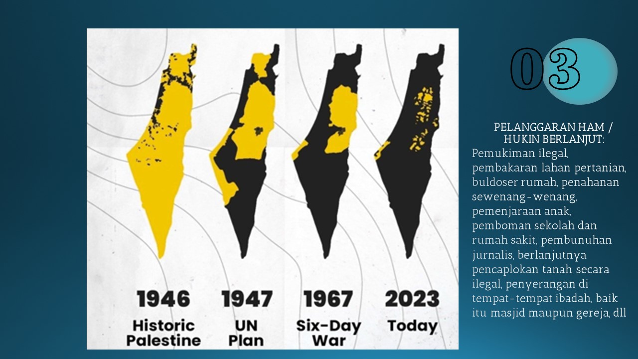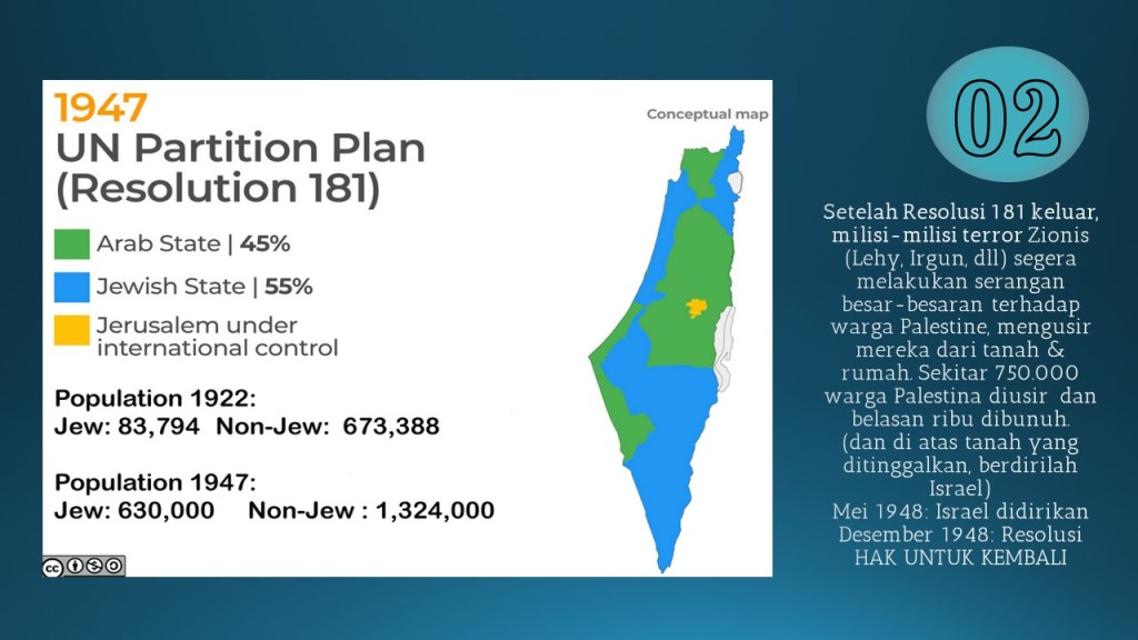 Jadi secara peta, di tahun 46 itu historic Palestine ini dari yang awalnya 100% di bawah kekaisaran Ottoman, lalu berdasarkan resolusi PBB di 1947 yang membagi 2 wilayah Palestine dimana Palestina hanya mendapatkan 45%,