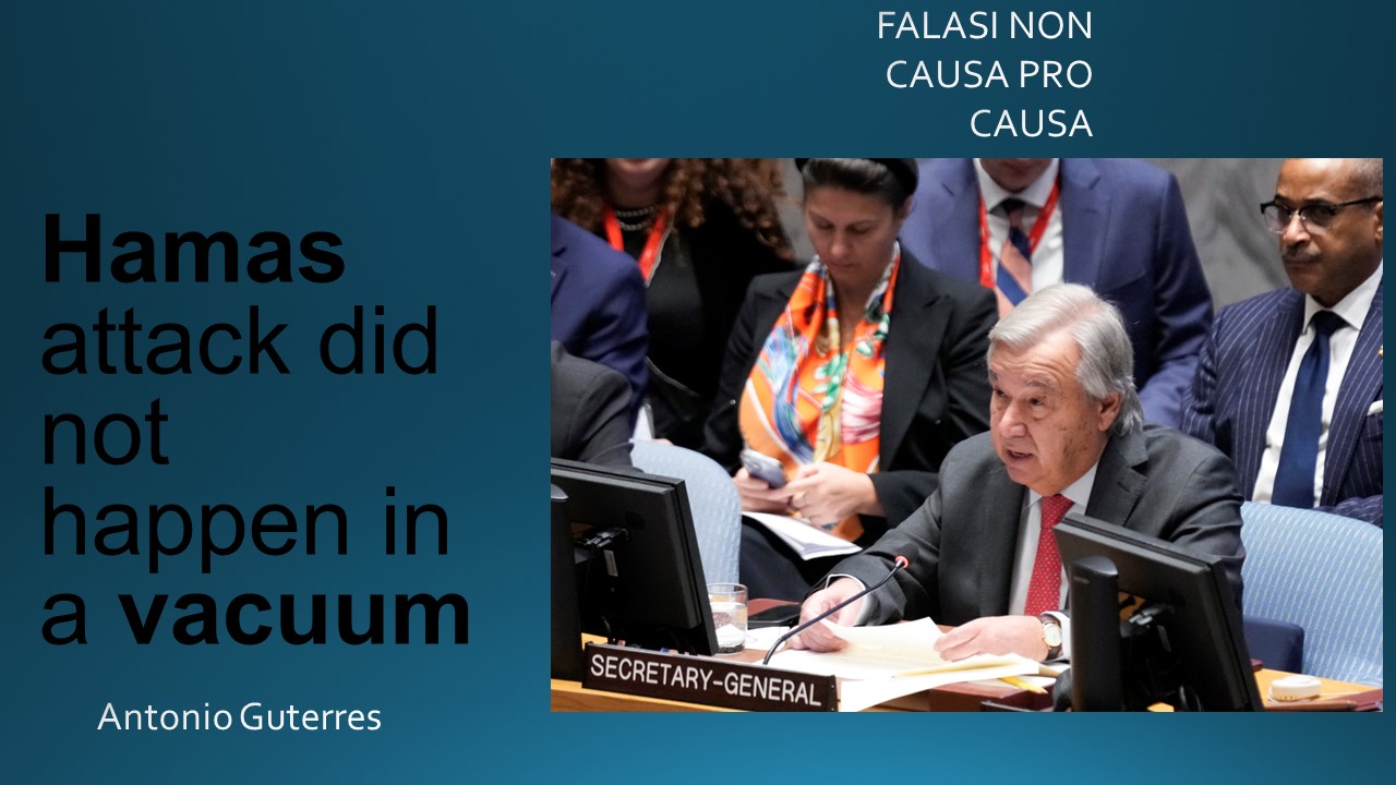 Analisis atau justifikasi dalam serangan 7 Oktober yang dimaksud oleh Antonio Guterres adalah agar kita memulai dalam memandang situasi ini jangan hanya dimulai di 7 Oktober, serangan Hamas tidak terjadi dalam ruang vakum, dimana selama 56 tahun orang-orang Palestina itu menyaksikan rumah-rumah mereka dirampas, keluarga mereka dibunuh, kemudian mereka mengalami pendudukan yang menyesakkan, itu adalah kalimat-kalimat Sekjen PBB yang selanjutnya.