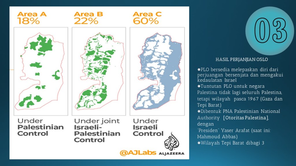 Yang jadi masalah di perjanjian Oslo ini adalah Tepi Barat wilayahnya Palestina ini tidak sepenuhnya diserahkan kepada Yaser Arafat (Otoritas Palestina), wilayah ini masih dibagi-bagi lagi, dimana yang betul-betul dikuasai oleh orang Palestina itu cuma 18%, sementara yang sisa 22% administrasinya ada di tangan Otoritas Palestina tapi militernya itu di tangan Israel, sedang sisanya 60% secara penuh dikontrol militer Israel.