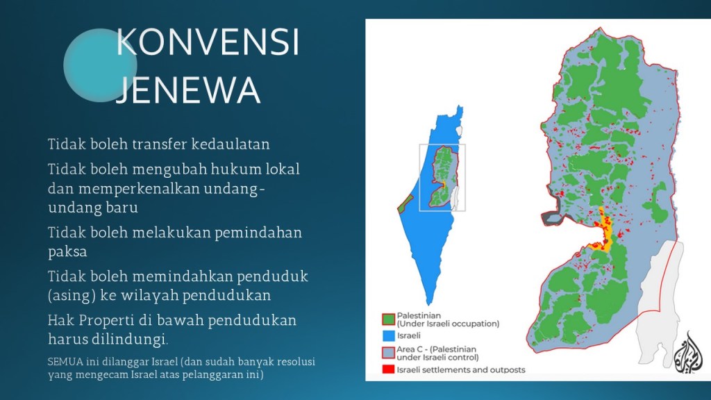 Konvensi Jenewa juga mengatakan tidak boleh melakukan pemindahan paksa, malah justru itu yang sampai hari ini masih terus dilakukan pemindahan paksa alias pengusiran, dan di atas tanah-tanah yang sudah dilakukan pengusiran warga Palestina itu lah kemudian dibangun perumahan-perumahan.