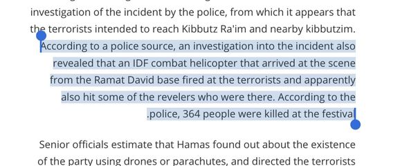[C] Selain ada pembantaian di festival music, juga ada pemabantaian di permukiman khusus Yahudi (Kibbutz). Di sana, tentara Israel juga menembak membabi buta, dan korbannya adalah orang Israel sendiri & militan Hamas. Ini dilaporkan oleh media Israel sendiri, mewawancarai saksi mata (orang Israel).