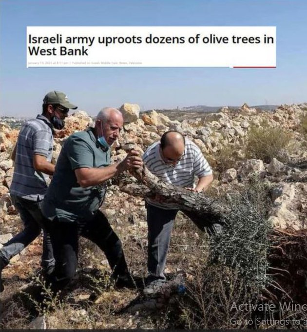Foto 3: terlihat petani Palestina b’usaha m’nanamkan lagi pohon zaitun yg dicabut tentara Israel. Ini kejadian Januari 2021. Ketika itu, buldoser militer Israel m’hancurkan 2 hektar lahan pertanian&puluhan pohon zaitun di Hebron, Tepi Barat.