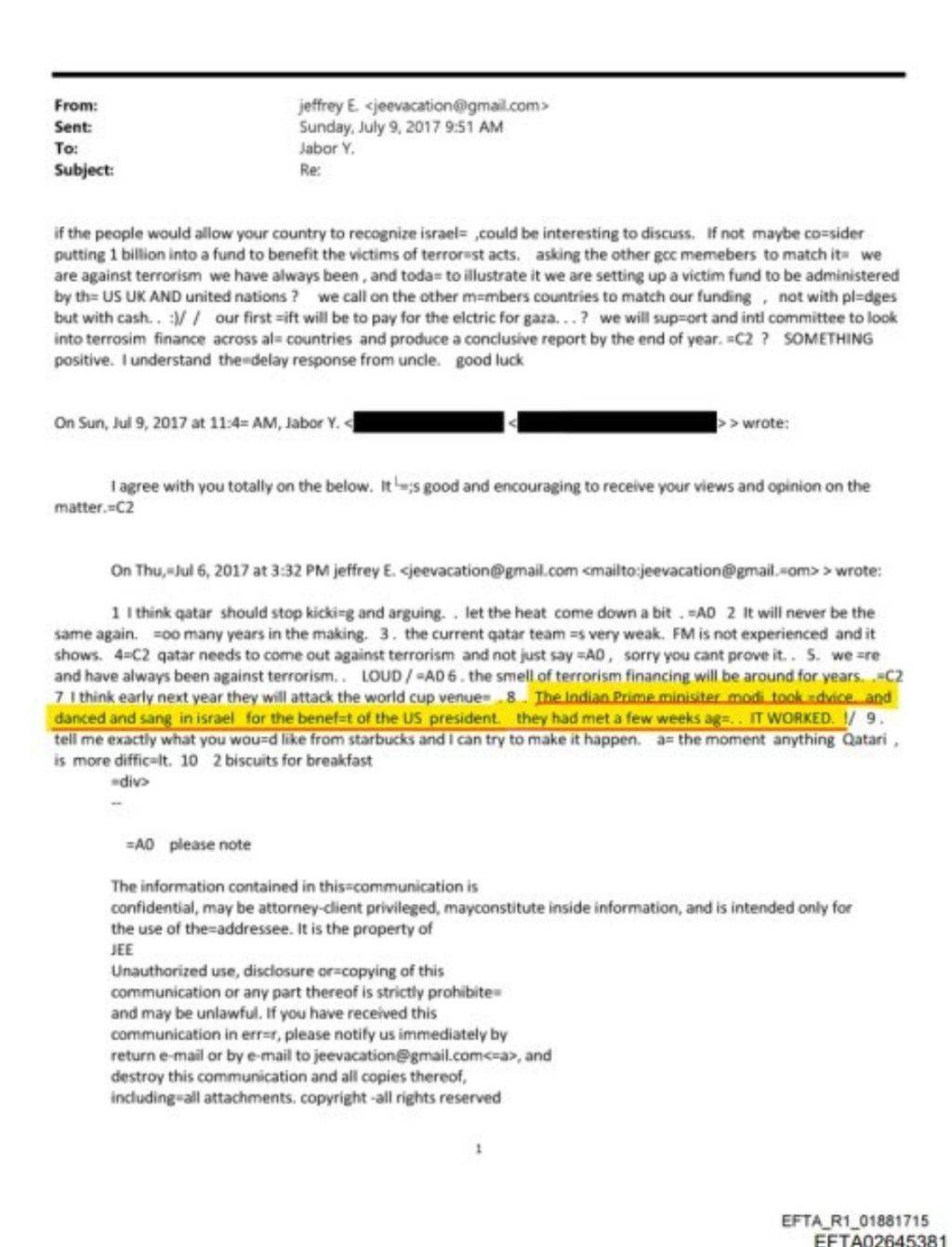 3. Jalur komunikasi rahasia PM Qatar dengan Menlu AS saat itu, Rex Tillerson. Epstein menggambarkan PM Qatar sebagai sosok yang tidak berpengalaman dan lemah, tetapi ia mampu membuat Tillerson dengan sabar menjelaskan kepada Trump mengapa invasi dan kolonisasi Uni Emirat Arab akan menjadi ide yang buruk. Tahun 2021, blokade berakhir dg perjanjian Saudi-Qatar.