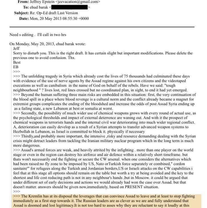 Sebuah email menunjukkan percakapan antara Jeffrey Epstein (JE) dan Perdana Menteri Israel Ehud Barak (EB) tahun 2013. EB mengirim draft pernyataan/statemen ke Epstein, minta dicek isinya. Lalu jawab JE: “perlu diedit, saya akan telpon dua jam lagi.” Intinya: membahas perlunya dan bagaimana mempercepat kejatuhan Assad.