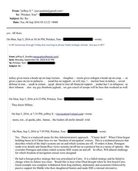 Dan.. dokumen Epstein mengkonfirmasi bahwa ISIS dan Al Qaida memang bentukan Mossad; atau minimalnya, berjejaring dengan Mossad. Komunikasi email itu terjadi tahun 2016 antara Jeffrey Epstein dan Tom Pritzker (anggota klan Pritzker, keluarga miliarder Yahudi terkemuka di AS; di antaranya menguasai jaringan hotel Hyatt).